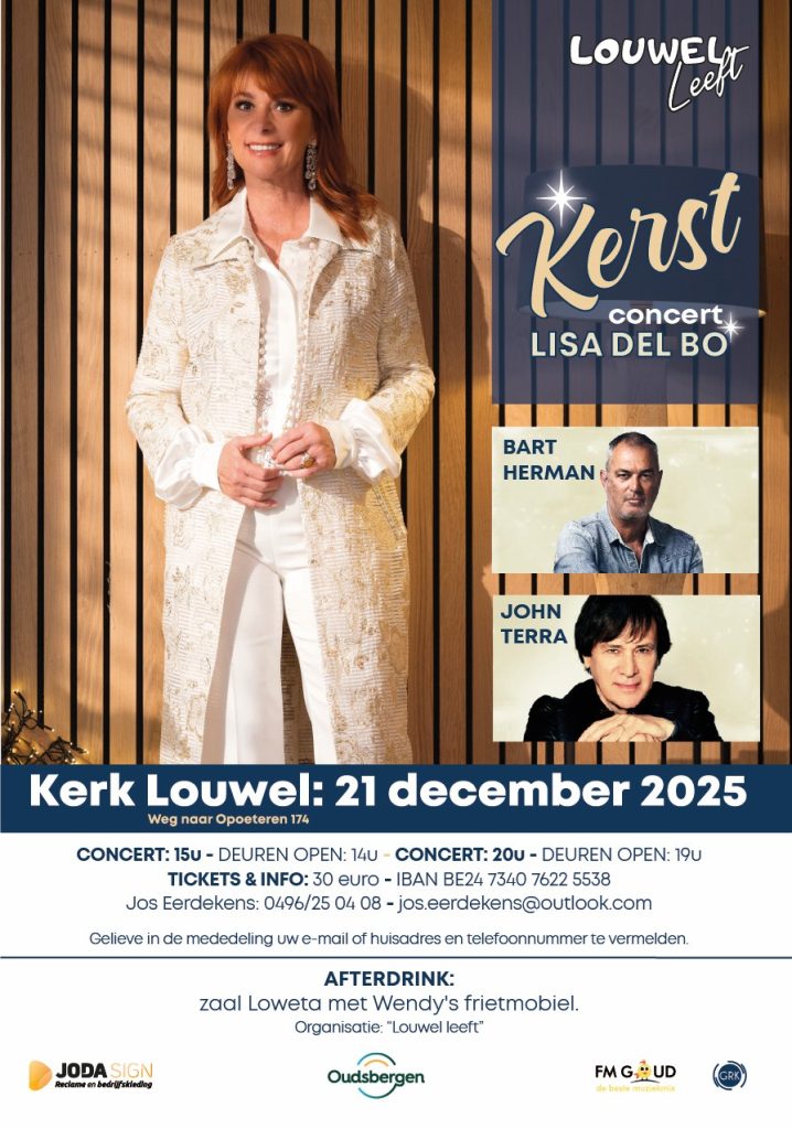 Op zondag 21 december organiseert Louwel leeft voor de tweede maal een prachtig kerstconcert in de Sint-Jozefskerk van Louwel. Ook ditmaal zal Lisa Del Bo onze gastzangeres zijn. Met haar orkest brengt zij een aantal prachtige liederen met een diepe religieuze inhoud naast natuurlijk ook een aantal kerstliederen. Zij brengt twee andere zangers mee namelijk Bart Herman en John Terra. Het kerstconcert zal zowel om 15 uur als om 20 uur plaats hebben. Op dit moment is de namiddagvoorstelling bijna uitverkocht, de avondvoorstelling heeft nog vrije plaatsen. Toch is het goed om tijdig je kaarten te bestellen. De plaatsen zijn genummerd. Tickets kan je bestellen bij Jos Eerdekens (jos.eerdekens@outlook.com of 0496/25 04 08). Tickets kosten 30 euro.